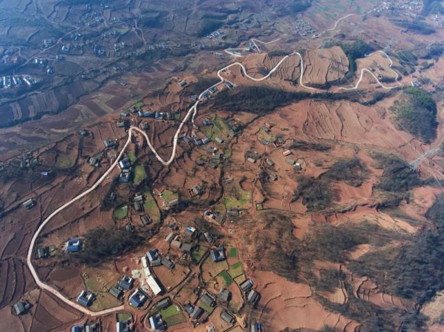 涼山彝族自治州美姑縣九口鄉(xiāng)四峨吉村6.3公里道路硬化項(xiàng)目從空中看來格外耀眼(2017年2月12日攝)。新華社記者劉坤攝