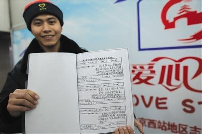 2月11日,北京西站北一出口外,愛心扶助員郭曉瀟向記者展示乘客們在留言簿上的留言。本版攝影/新京報記者 彭子洋