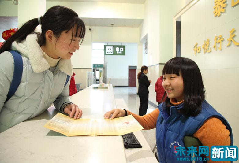 由于李厚萱行動(dòng)不便,志愿服務(wù)期間她的母親田秀云全程陪同。李厚萱在咨詢臺(tái)工作的時(shí)候,閑下來的田秀云便幫忙整理、分發(fā)列車時(shí)刻表,是泰山火車站“特殊”春運(yùn)志愿者。