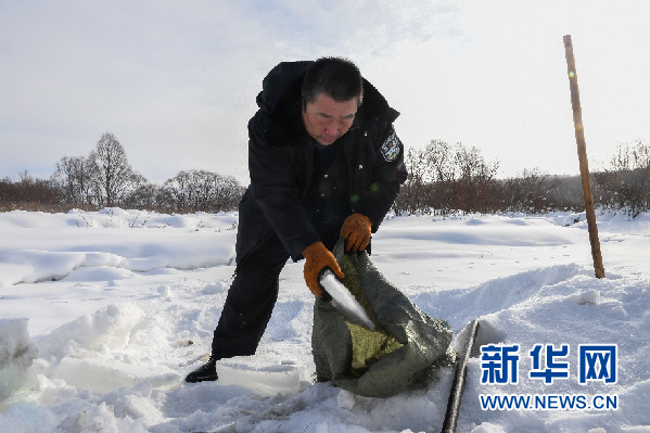 2月14日,白玉華在河溝中取冰。前幾天站內(nèi)柴油發(fā)電機(jī)出現(xiàn)故障,不能抽水,用水只能靠鑿冰化水。新華社記者 劉磊 攝
