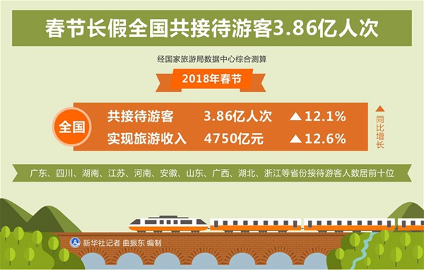 經(jīng)國家旅游局數(shù)據(jù)中心綜合測算,今年春節(jié)全國共接待游客3.86億人次,同比增長12.1%,實現(xiàn)旅游收入4750億元,同比增長12.6%。