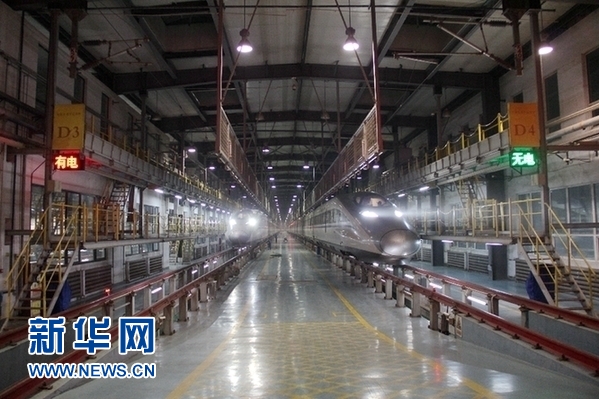 凌晨時(shí)分,石家莊動(dòng)車運(yùn)用所內(nèi)依舊燈火通明。新華網(wǎng) 金佳緒 攝
