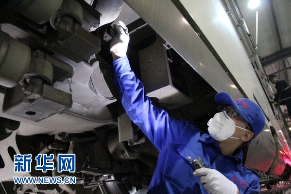 石家莊動(dòng)車運(yùn)用所的檢修工正在作業(yè)。新華網(wǎng) 金佳緒 攝