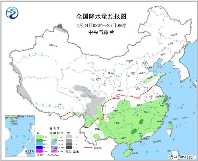 24日08時至25日08時,新疆北部、西藏西部、川西高原、青海東南部、山東北部等地有小到中雪或雨夾雪,局地大雪;云南東部、江漢南部、江南大部、華南大部等地有小雨,局地中雨。華北南部、黃淮、江漢東部、江淮北部等地及環(huán)渤海地區(qū)有4~6級風。黃海中部、東海北部等海域?qū)⒂?~7級、陣風8級的東北風。