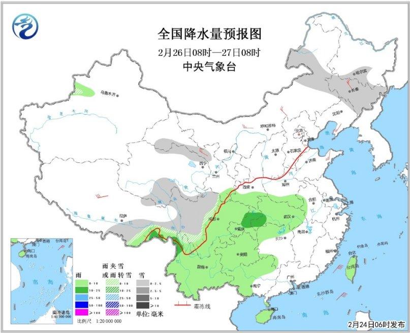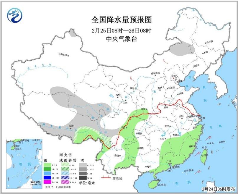 25日08時至26日08時,青藏高原中部和南部等地有小雪或雨夾雪;西北地區(qū)東南部、四川盆地、江南南部、華南中東部、云南西北部和東部、海南島、臺灣等地有小雨或陣雨。內(nèi)蒙古中西部等地有4~5級風。東海大部、臺灣海峽等海域有6~7級、陣風8級的東北風。