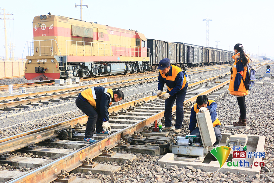 農(nóng)歷正月初八這天,邰芳鵬和工區(qū)3名年輕職工一同到現(xiàn)場,對阿克蘇站信號機和道岔進行巡視檢查。中國青年網(wǎng)通訊員 姚旭東 攝