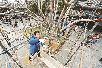 “為了修剪一棵樹而專門搭起腳手架,所做功夫之細(xì),這在北京城里也是較為少見的。”頤和園古樹管護(hù)中心負(fù)責(zé)人韓紅巖說,其目的是盡最大努力保護(hù)古樹。如果用梯子,移動的時候容易把花苞碰掉,損壞枝條。樹冠深處的一些花苞也夠不著,存在修剪死角。頤和園采用搭腳手架這種獨(dú)有的修剪方式,所有問題也就迎刃而解了。