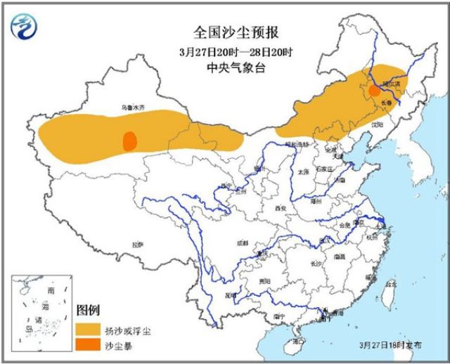 預(yù)計27日20時至28日20時,受大風(fēng)天氣影響,新疆南疆盆地、內(nèi)蒙古、甘肅西部、遼寧西北部、吉林西部、黑龍江西南部、河北北部、北京北部等地的部分地區(qū)有揚沙或浮塵天氣,其中新疆南疆盆地、吉林西部等地局部有沙塵暴。
