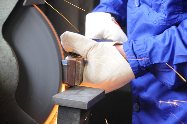 龍小平為記者現(xiàn)場(chǎng)演示車(chē)工最基礎(chǔ)的一道工序——磨刀。新華網(wǎng) 聶晨靜 攝