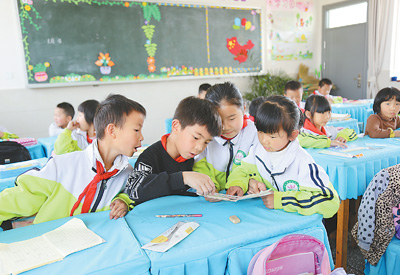 吉花小學(xué)一年級學(xué)生利用中午時(shí)間一起做作業(yè)。李發(fā)興 攝