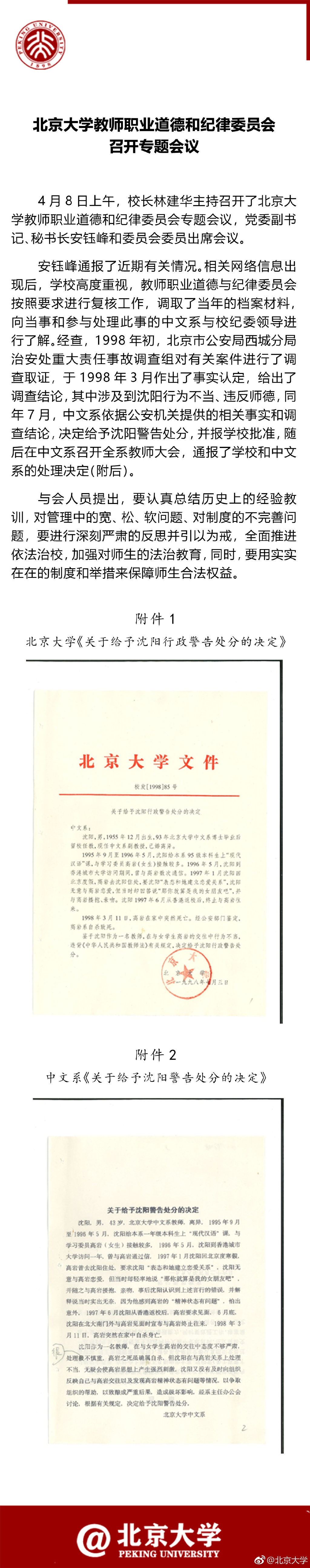 據(jù)北京大學(xué)官方微博消息,北京大學(xué)教師職業(yè)道德和紀(jì)律委員會(huì)今日召開(kāi)專題會(huì)議 ,通報(bào)“沈陽(yáng)事件”,并出示了當(dāng)年對(duì)其警告處分的決定。