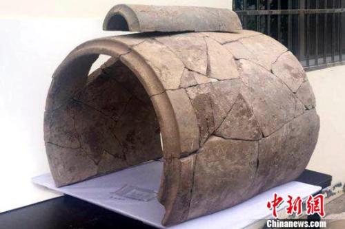 資料圖:2017年,考古人員在位于西安的櫟陽(yáng)遺址發(fā)現(xiàn)一件戰(zhàn)國(guó)時(shí)期的筒瓦,被確認(rèn)為目前中國(guó)已知體量最大的古代筒瓦。圖為出土的巨型筒瓦和普通陶瓦。阿房宮與上林苑考古隊(duì)供圖
