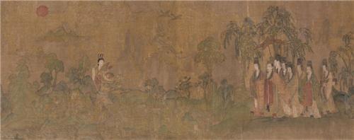 《洛神賦圖》取材于曹植的《洛神賦》,是東晉顧愷之的畫作。它將“曹植與洛水之神相會、相知、相愛,卻因人神之戀無望而依依惜別”的凄美愛情故事表達得淋漓盡致。這幅畫的原作遺失,現(xiàn)存于世的是宋代的四件摹本,分別藏于北京故宮博物院、遼寧省博物館和美國弗利爾美術館。