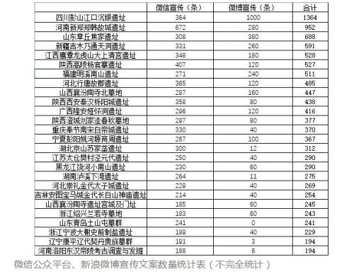 在“2017年度全國十大考古新發(fā)現(xiàn)”前一天,這篇文章對26項入圍“2017年度全國考古十大新發(fā)現(xiàn)”項目的網(wǎng)絡(luò)宣傳文案數(shù)量進行了統(tǒng)計。胡宇煊在統(tǒng)計了微信公眾平臺、新浪微博宣傳文案數(shù)量后,對這26個項目進行排序,并大膽預(yù)測了2017年度全國考古十大新發(fā)現(xiàn)的評選結(jié)果。