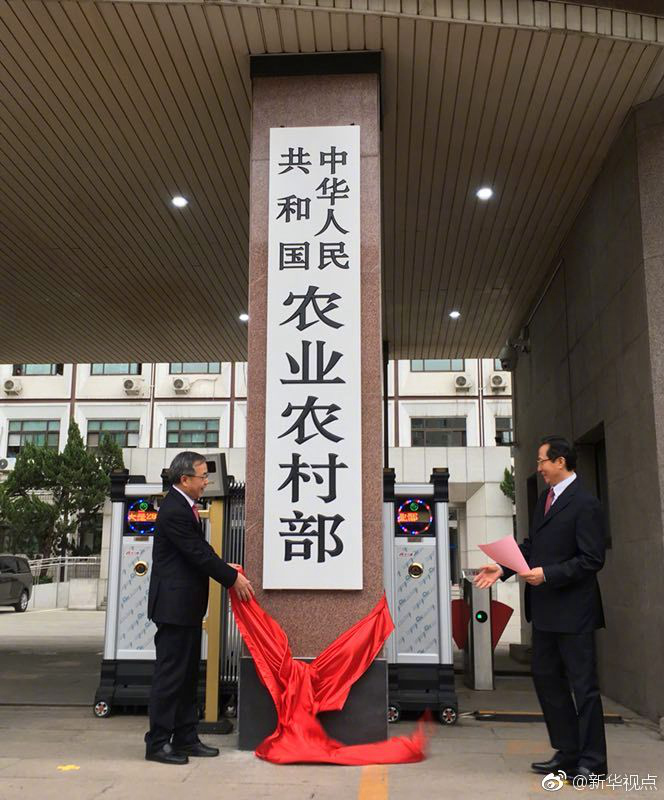 新組建的農(nóng)業(yè)農(nóng)村部4月3日正式掛牌。韓長賦任部長、黨組書記。(新華社“新華視點”微博 記者 董峻)