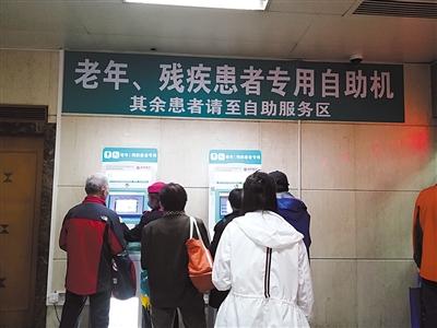 昨日,同仁醫(yī)院一樓門診大廳,老年人正在使用專用自助機(jī)。新京報(bào)記者 戴軒 攝 圖片來源:新京報(bào)