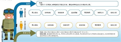 男青年應(yīng)征需經(jīng)過網(wǎng)上登記、初審初檢、體檢政審、走訪調(diào)查、預(yù)定新兵、張榜公示、批準(zhǔn)入伍7個環(huán)節(jié)。