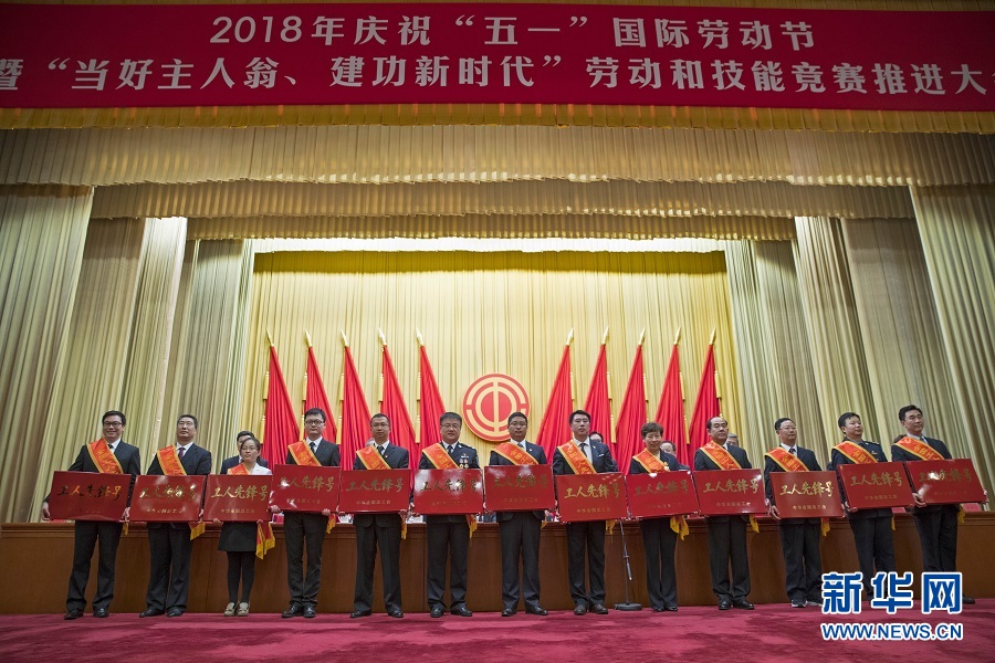 4月28日,榮獲全國工人先鋒號的部分集體代表在大會上合影。當日,2018年慶?!拔逡弧眹H勞動節(jié)暨“當好主人翁、建功新時代”勞動和技能競賽推進大會在北京人民大會堂舉行。 新華社記者 才揚 攝