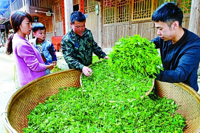 在福建省武夷山國家級自然保護(hù)區(qū)內(nèi)的桐木村,回鄉(xiāng)創(chuàng)業(yè)的大學(xué)畢業(yè)生徐建(右)攤晾鮮茶葉。新華社發(fā)