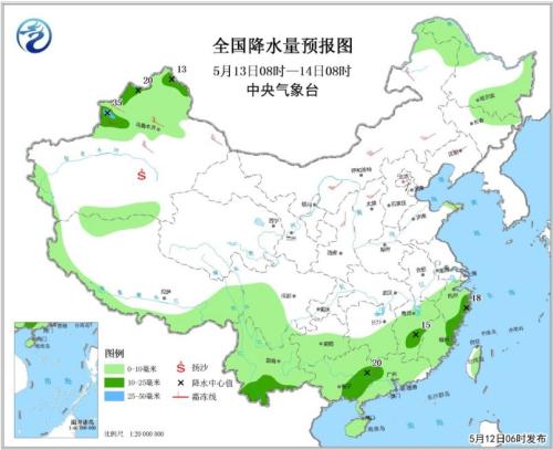 5月12日08時(shí)至13日08時(shí),華北東部、江南北部和西南部、華南西部和南部、貴州東南部、云南南部等地有中到大雨,其中,云南南部、廣西北部和南部局地有暴雨,廣西東部、廣東西南部等地有分散性暴雨或大暴雨,上述局部地區(qū)將伴有雷暴大風(fēng)、短時(shí)強(qiáng)降水等強(qiáng)對(duì)流天氣,其中,河北中南部、北京、天津、山西東部、山東北部等地局地將有雷暴大風(fēng)或冰雹天氣。東北地區(qū)南部和北部、華北西部、西北地區(qū)東北部、內(nèi)蒙古、新疆北部等地的部分地區(qū)有4~6級(jí)風(fēng),新疆南疆盆地、內(nèi)蒙古中西部局地有揚(yáng)沙或浮塵(見圖1)。