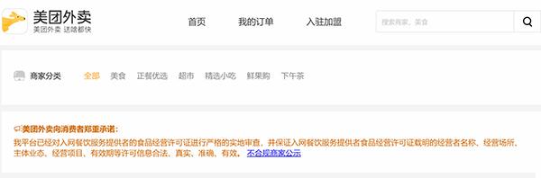 從哪里看違規(guī)餐飲店鋪公示情況?首先,打開三個外賣平臺的網(wǎng)頁版并登陸,選擇“北京地區(qū)”后,可以看到網(wǎng)頁最上端明顯位置發(fā)布了這樣的承諾:“我平臺已經(jīng)對入網(wǎng)餐飲服務(wù)提供者的食品經(jīng)營許可證進(jìn)行嚴(yán)格的實地審查,并保證入網(wǎng)餐飲服務(wù)提供者食品經(jīng)營許可證載明的經(jīng)營者名稱、經(jīng)營場所、主體業(yè)態(tài)、經(jīng)營項目、有效期等許可信息合法、真實、準(zhǔn)確、有效?!?/p>