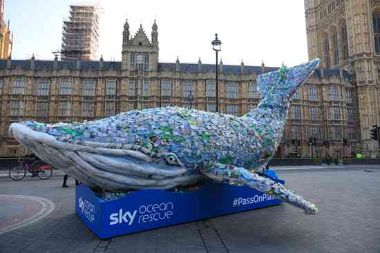 英國會(huì)大廈前現(xiàn)巨型塑料鯨魚,呼吁減少海洋垃圾。視覺中國供圖