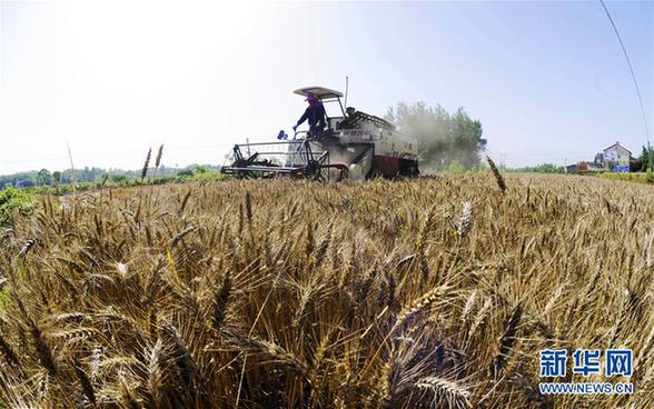 5月23日,在湖北省襄陽(yáng)市襄城區(qū)尹集鄉(xiāng)尤河村,農(nóng)民駕駛農(nóng)機(jī)收割小麥。新華社發(fā)(安富斌 攝)