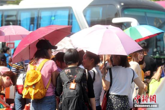 5月31日,北京遭遇高溫天氣。北京西站廣場(chǎng)候車民眾撐傘防曬。 中新社記者 張宇 攝