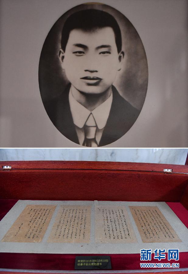 拼版照片:上圖為陳覺像;下圖為湖南省長沙市烈士公園展出的陳覺烈士寫給妻子趙云霄的遺書(5月7日攝)。新華社發(fā)