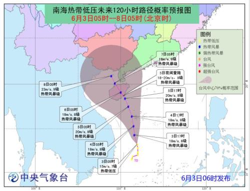 據(jù)中央氣象臺(tái)消息,預(yù)計(jì)3日夜間至5日,西南地區(qū)東部、江南、華南等地自西向東將有一次較強(qiáng)降水天氣過程;南海及華南等地將有較大風(fēng)雨天氣,中央氣象臺(tái)3日06時(shí)繼續(xù)發(fā)布熱帶低壓預(yù)報(bào)。