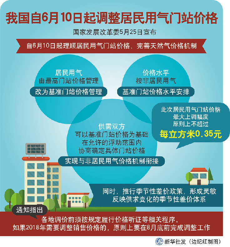 國家發(fā)展改革委5月25日宣布,自6月10日起理順居民用氣門站價格、完善價格機制。這是我國自2010年以來首次調(diào)整居民用氣門站價格,最大上調(diào)幅度原則上不超過每立方米0.35元。