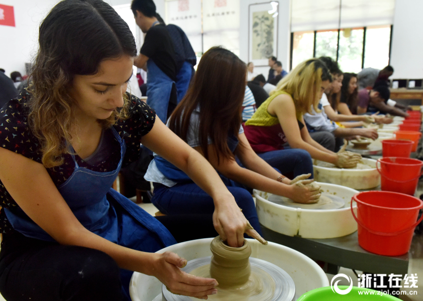2018年6月3日,來自30多個(gè)國家的70多名留學(xué)生,在武義漢坊婺窯體驗(yàn)館開心學(xué)習(xí)拉坯。