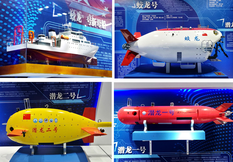這是國家深?;亍白呦蛏詈!闭箯d內(nèi)陳列的我國各類科研設(shè)備模型(拼版照片,2017年12月19日攝)。新華社記者 李紫恒 攝