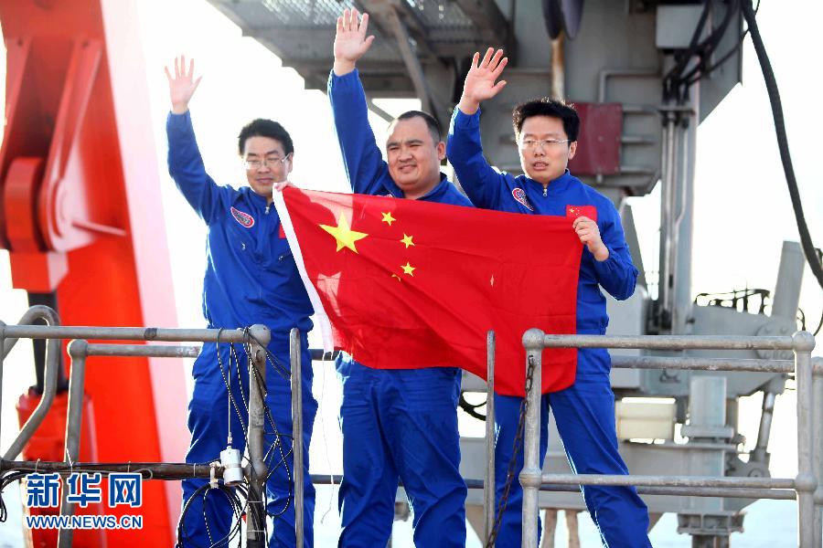 三位試航員走出“蛟龍”號載人潛水器后手舉國旗揮手致意(2012年6月24日攝)。 新華社記者 羅沙 攝
