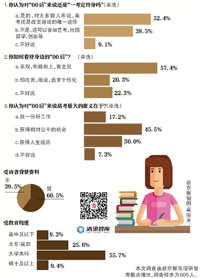 一年一度的高考剛剛落下帷幕。據(jù)教育部統(tǒng)計,今年全國共有975萬名考生參加高考,人數(shù)創(chuàng)下最近8年來的新高,比去年增加了35萬人。值得注意的是,今年參加高考的學(xué)生,大多也是在2000年出生的“千禧寶寶”。雖然說起來,其實所謂的“00后”,跟“80后”、“90后”,以及任何一種“后”,本質(zhì)上都沒有什么區(qū)別。在高考面前,在人生的關(guān)口面前,他們都是命運的“考生”。但是,時代不同,一代人也自有一代人不同的際遇。對此,我們需要關(guān)注什么?本期“京報調(diào)查”(新京報與清研智庫聯(lián)合推出)就此展開調(diào)查。