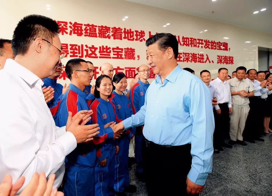 ▲ 4月12日,習(xí)近平總書記在位于三亞的中國科學(xué)院深??茖W(xué)與工程研究所,同“深海勇士”號載人潛水器設(shè)計(jì)師和深潛團(tuán)隊(duì)親切交談 李學(xué)仁攝