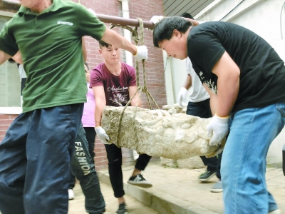 記者昨天在清河街道院內(nèi)看到,4件漢白玉螭頭的規(guī)格幾乎相同,長度近一米,寬度在30至40厘米,每個都重有幾百斤。龍頭的雕刻紋路非常清晰,雙目圓睜、眉毛上擰、鼻尖高聳、嘴唇上卷……街道相關(guān)負責人告訴記者,確認螭頭為圓明園流散文物之后,清河街道第一時間上報海淀區(qū)文委,并在文委的指導(dǎo)和同意下,將文物歸還圓明園。