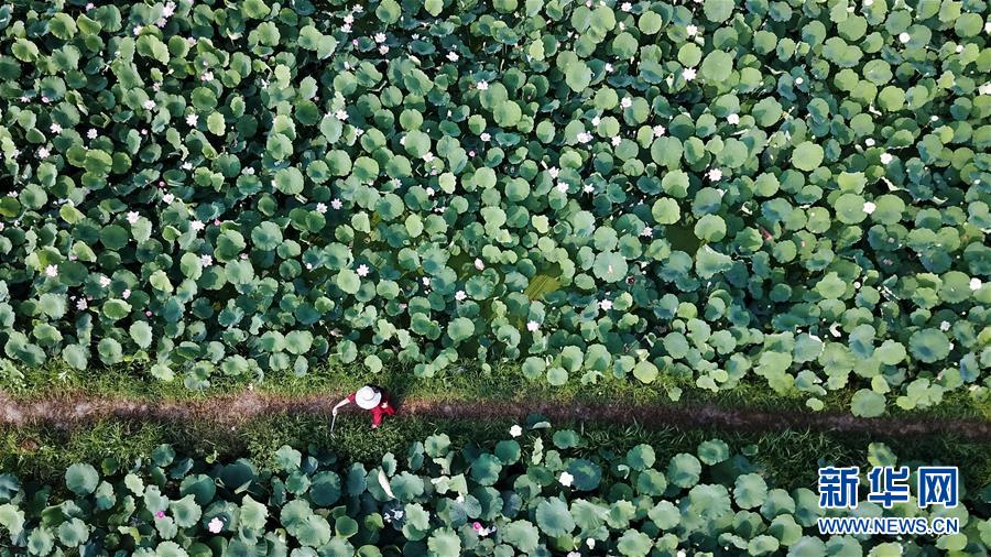 6月14日,游客在銅陵市西湖村荷花園內(nèi)賞荷(無(wú)人機(jī)拍攝)。隨著氣溫升高,安徽省銅陵市西聯(lián)鎮(zhèn)西湖村荷花園內(nèi)的300多畝荷花絢麗綻放,吸引游客前來(lái)賞荷。 新華社記者 張端 攝