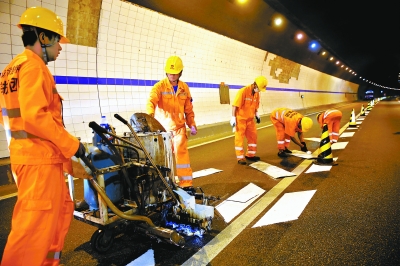 昨天上午,在懷柔區(qū)分水嶺隧道,路政養(yǎng)護(hù)人員正在安裝各類(lèi)交通安全標(biāo)識(shí)。隨著防撞護(hù)欄、反光輪廓、視覺(jué)減速標(biāo)識(shí)陸續(xù)安裝完成,幽暗狹長(zhǎng)的隧道變得明亮起來(lái)。據(jù)介紹,反光輪廓和視覺(jué)減速標(biāo)識(shí)首次在京隧道投入使用,無(wú)論白天還是夜間,明亮的標(biāo)識(shí)都能引導(dǎo)司機(jī)看清路面。