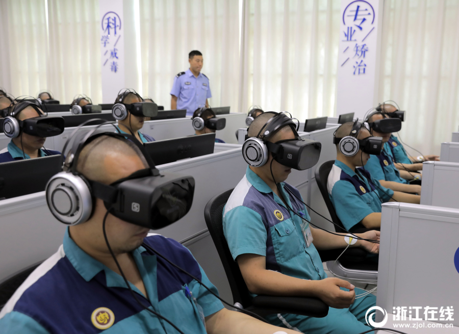 6月26日,浙江拱宸強(qiáng)制隔離戒毒所內(nèi),戒毒人員通過腦電技術(shù)和VR技術(shù)輔助戒毒。這些黑科技可以讓戒毒人員身臨其境地體會(huì)到吸毒的危害,從心理上減弱對(duì)毒品的依賴。(浙江在線記者 錢璐斌 徐文迪 攝)