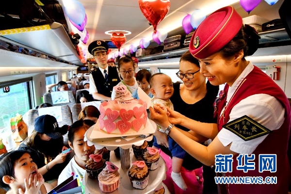 6月26日,在北京南至上海虹橋的G1次“復(fù)興號(hào)”列車上,乘務(wù)員與旅客一起切蛋糕慶祝。當(dāng)日,由北京南至上海虹橋的G1次“復(fù)興號(hào)”列車上舉行“復(fù)興號(hào)”運(yùn)營一周年慶?;顒?dòng)。“復(fù)興號(hào)”是由中國鐵路總公司牽頭組織研制、具有完全自主知識(shí)產(chǎn)權(quán)、達(dá)到世界先進(jìn)水平的中國標(biāo)準(zhǔn)動(dòng)車組,自2017年6月26日投入運(yùn)營以來,以其良好的乘車體驗(yàn)廣受旅客歡迎。新華社發(fā)(楊寶森 攝)