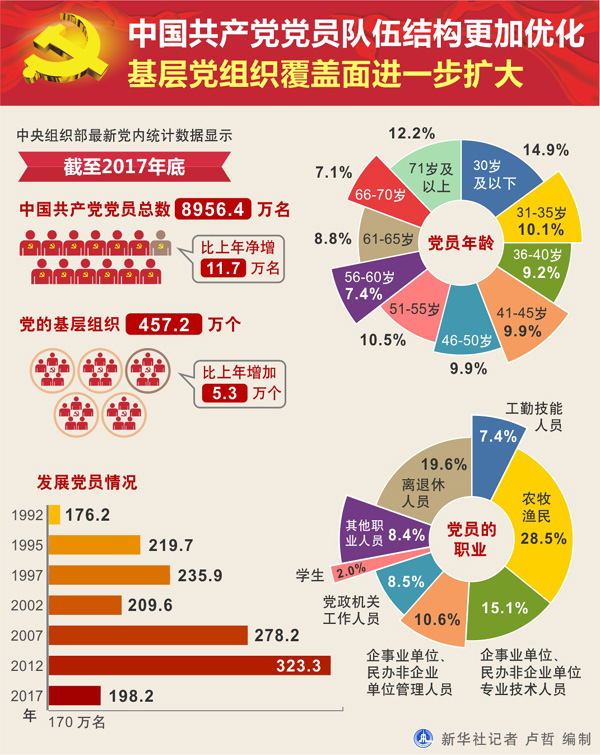 圖表:中國共產(chǎn)黨黨員隊伍結(jié)構(gòu)更加優(yōu)化 基層黨組織覆蓋面進一步擴大 新華社記者 盧哲 編制