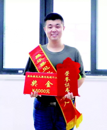 近兩個月前,昌樂小伙劉洋明不顧個人安危徒手將一名墜樓的男童接住,劉洋明見義勇為的事跡得到廣泛贊譽和關注。7月4日下午,劉洋明被昌樂縣授予“見義勇為先進個人”榮譽稱號,并獎勵5000元獎金,然而,他轉身就將獎金捐出。