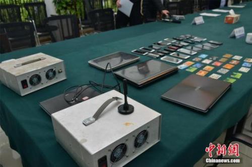 資料圖:浙江湖州吳興區(qū)警方現(xiàn)場展示繳獲的偽基站作案工具。中新社發(fā) 吳興公安 攝