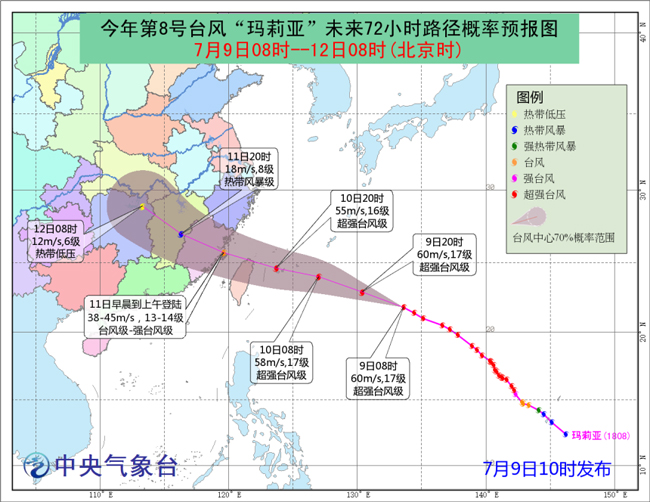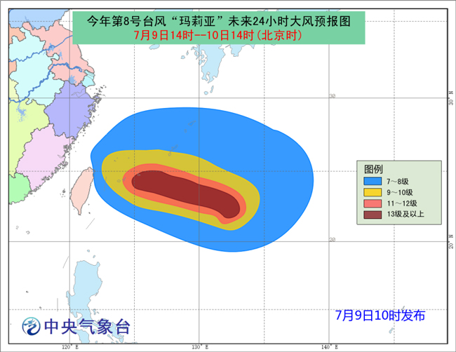 大風(fēng)預(yù)報:9日14時-10日14時,臺灣東北洋面和東海南部的中東部海域的風(fēng)力將逐漸加大到7-10級,部分海域風(fēng)力可達11-12級;琉球群島以東洋面將有9-12級大風(fēng),臺風(fēng)“瑪莉亞”中心經(jīng)過的附近洋面的風(fēng)力有13-17級。