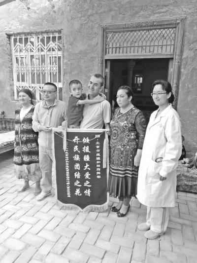 圖為北京援疆醫(yī)生登門看望和田縣布扎克鄉(xiāng)先心病兒童赴京救治后康復(fù)情況,收到當(dāng)?shù)鼐S吾爾族群眾送上的錦旗。本報(bào)記者余向東文/圖