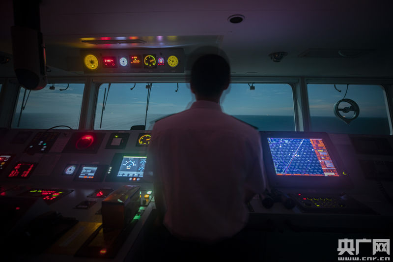 使上好大勁兒才推開駕駛室那道門,三副陳澤龍正站在正中間的操作臺旁,緊盯著眼前有近百種大大小小的儀器設(shè)備磁航儀、雷達(dá)儀等,他周圍的操作臺、海圖室、駕駛員休息區(qū)界限分明。不同于樓下的一個個小房間,駕駛臺相當(dāng)寬敞,再加上270度的全景玻璃窗,白天的話視野一定極好,但仍逃脫不了單調(diào)的“海天圖”。