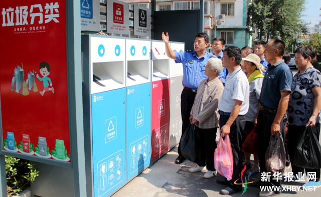 2018年7月13日,宿遷市宿豫區(qū)城管局的城管人員正在“垃圾分類站”現場引導居民分類、投放垃圾。孫東城 攝 視覺江蘇網供圖