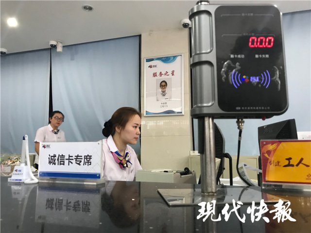 現(xiàn)代快報(bào)記者看到,周萍將市民卡交到營(yíng)業(yè)人員手中,經(jīng)過(guò)核驗(yàn),確認(rèn)她為民政部門報(bào)送的"誠(chéng)實(shí)守信好市民",點(diǎn)擊升級(jí),不到1分鐘,有著就醫(yī)、乘車等功能的市民卡,就變身為"市民誠(chéng)信卡"。