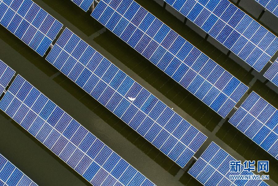 一只白鷺從光伏板上飛過(guò)(6月21日攝)。浙江省湖州市和孚鎮(zhèn)的“漁光互補(bǔ)”光伏發(fā)電項(xiàng)目建設(shè)在4200多畝魚(yú)塘上,40多萬(wàn)塊太陽(yáng)能光伏板下養(yǎng)殖小龍蝦和青蝦等水產(chǎn),千畝魚(yú)塘與綠色光伏電站構(gòu)成一幅和諧的生態(tài)美景圖。 新華社記者 徐昱 攝